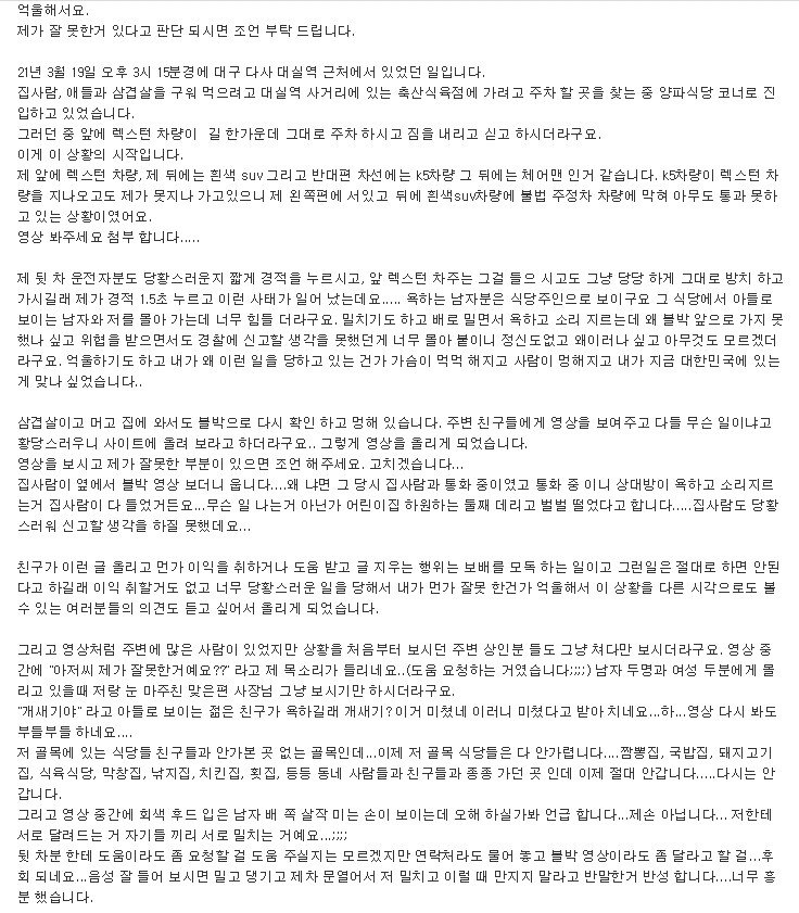 억울해서요.제가 잘 못한거 있다고 판단 되시면 조언 부탁 드립니다. 21년 3월 19일 오후 3시 15분경에 대구 다사 대실역 근처에서 있었던 일입니다.