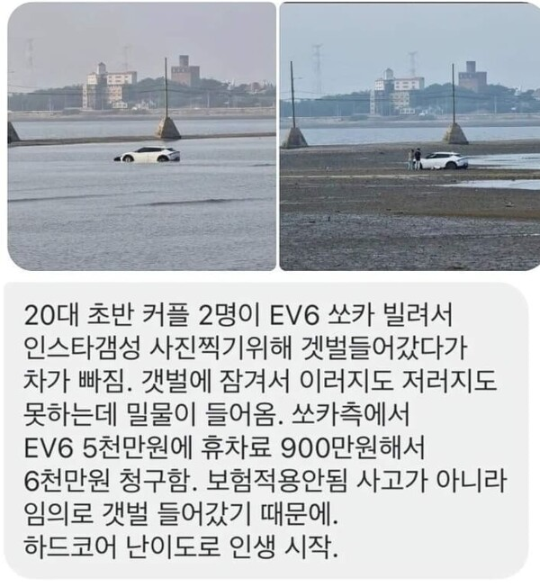 최근 온라인 커뮤니티와 SNS상에서 갯벌에 빠진 EV6차량 인스타 감성 사진을 찍다