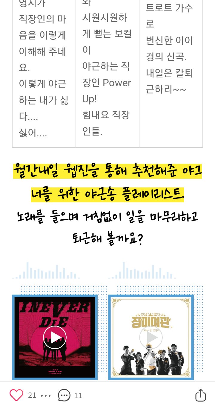 어차피 해야 할 야근이라면 미뤄봤자 시간 늦츨 뿐. 에너지 부스터 같은 야근송 들으며
