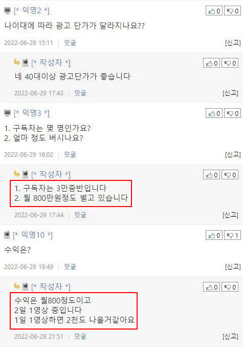 2일 1영상을 게재하며 월 수입은 약 800만원 정도라고 한다.
