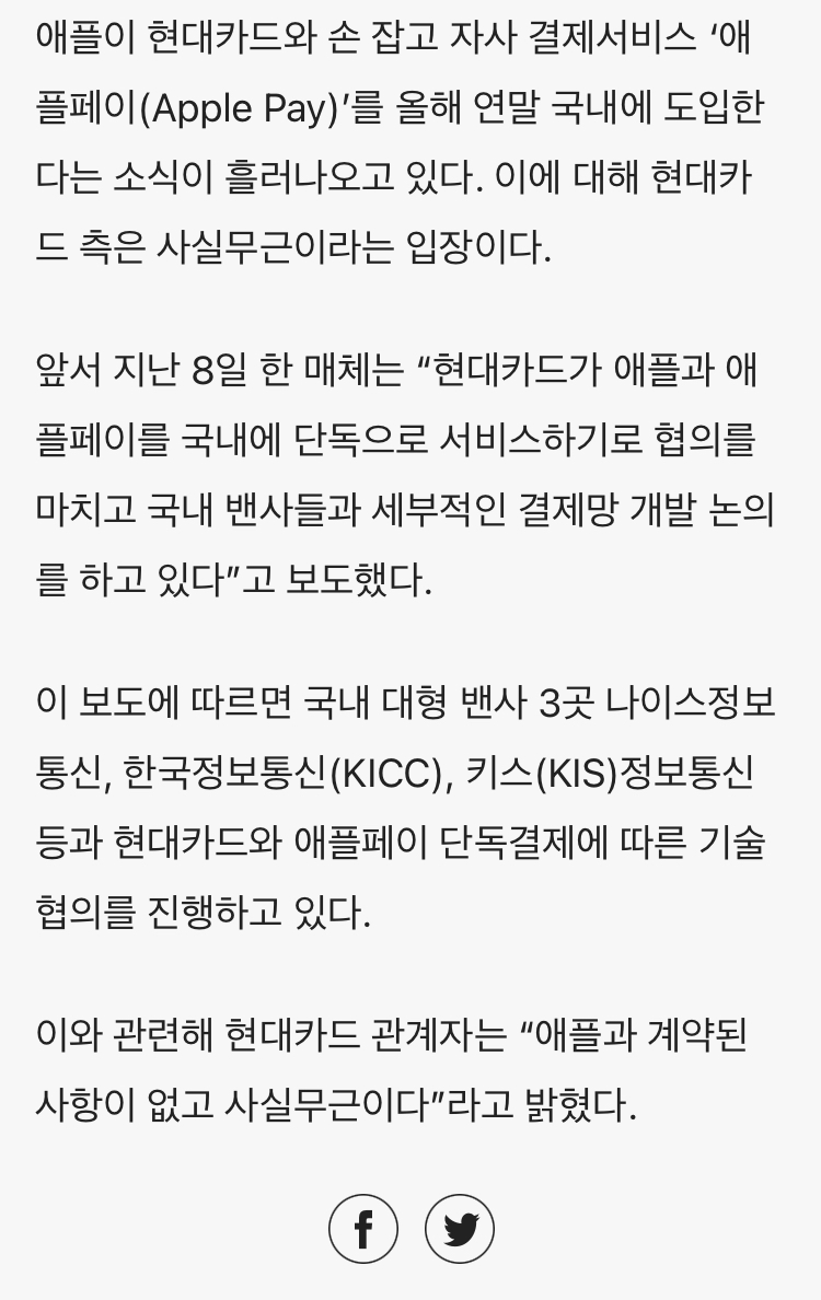 현대카드 측 관계자는 "애플과 계약된 사항이 없고 사실 무근이다." 라며