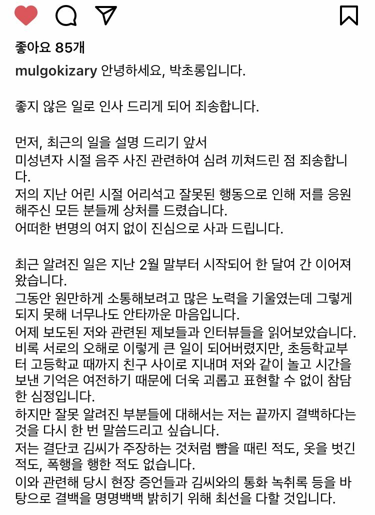 미성년자 시절 음주 사진 관련하여 심려 끼쳐드린 점 죄송합니다.