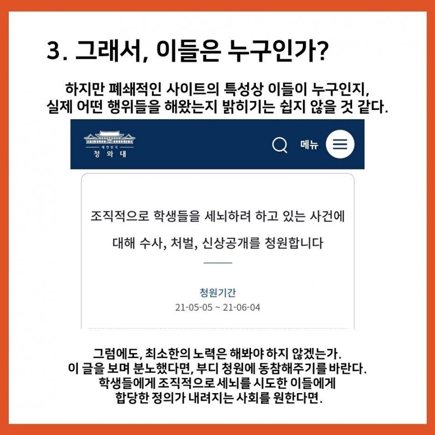조직적으로 학생들을 세뇌하려 하고 있는 사건에 대해 수사, 처벌, 신상공개를 청원합니다 > 대한민국 청와대 (president.go.kr)