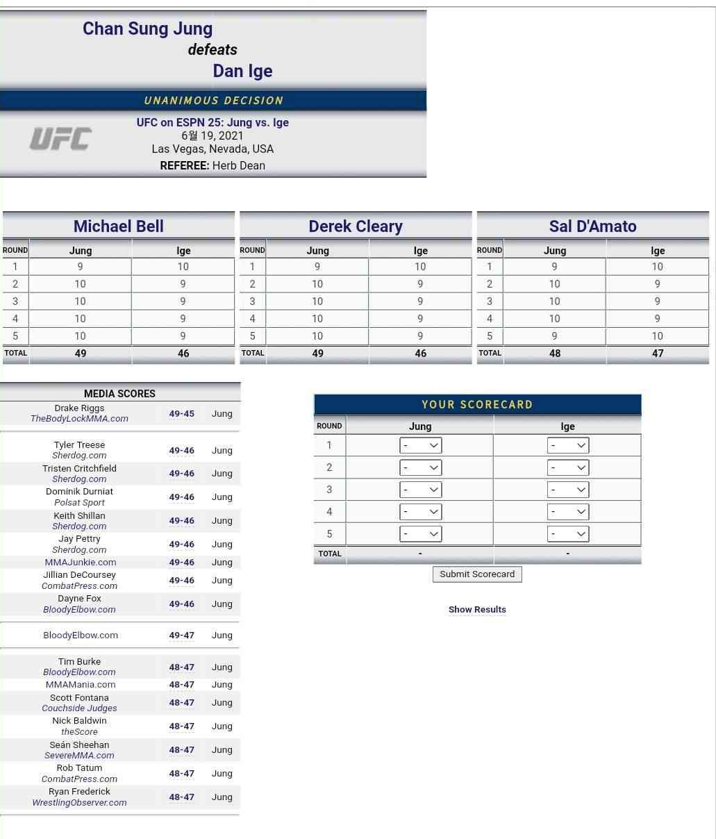 경기는 정찬성 우세 속에 끝나며 판정승으로 이어졌다.