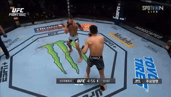 4라운드에 적극적으로 나서며 돌격 했으나 정찬성의 거리와 스탠스