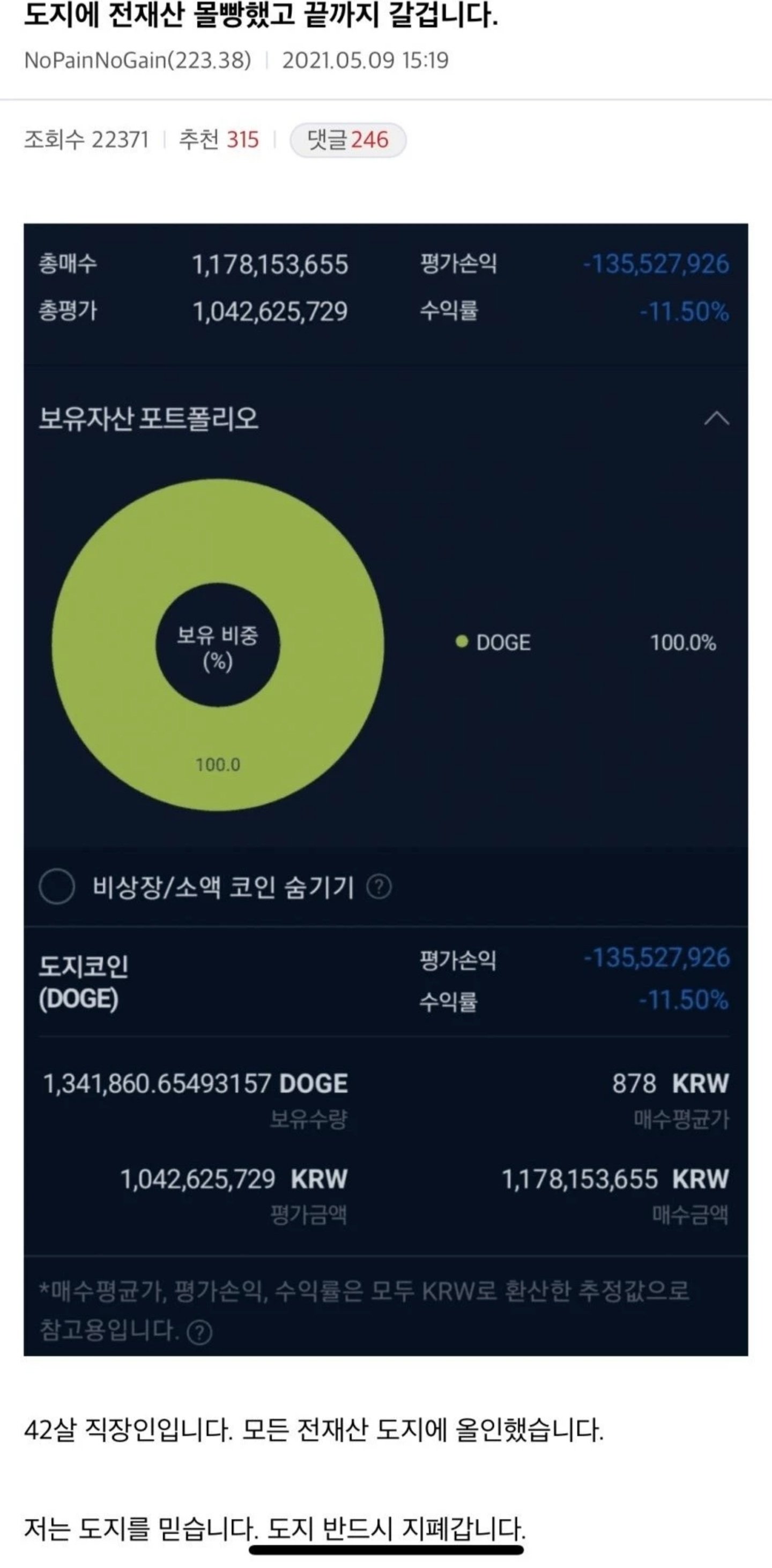 한 누리꾼은 전 재산 11억을 투자 인증샷을 남기며
