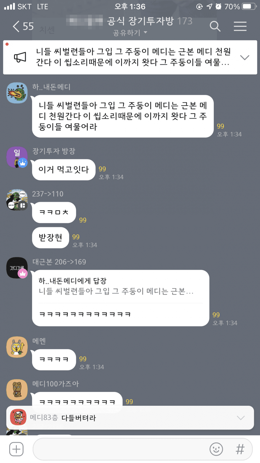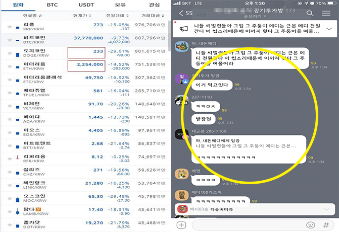 코인 폭락에 긍정에너지를 전하는 단톡방 근황